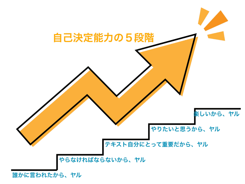 私たちの行動の動機づけには、さまざまなレベルがあります。自己決定理論では、その「自己決定能力」を5つの段階で説明しています。