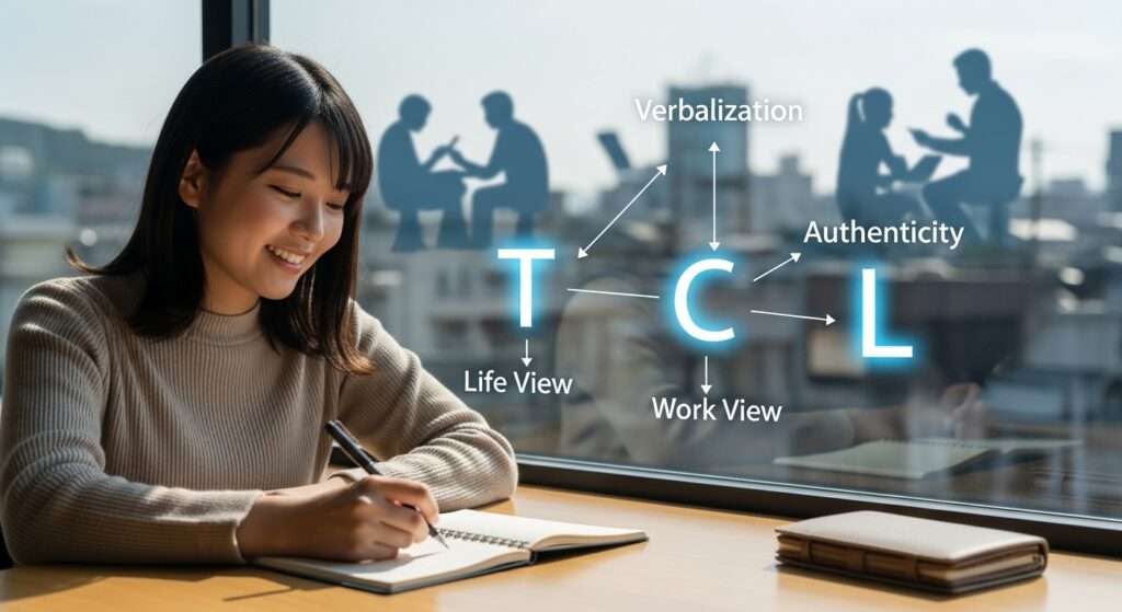 TCL分類で行動特性を整理したら、次はさらに深く、あなたの「根っこ」にある人生観と、そこから伸びる仕事観を言語化しましょう。これが明確であれば、あなたの言葉は揺るぎないものになります。
